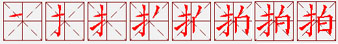 拍字的基本解释: ● 拍pāi ㄆㄞˉ ◎ 用手掌打:拍击。拍掌。拍抚。拍案叫绝。 ◎ 浪涛冲击:拍岸。 ◎ 拍打东西的用具:拍子(亦是计算乐音长短的单位)。 ◎ 乐曲的节奏:拍节。 ◎ 摄影:拍摄。拍照。拍片子。 ◎ 发出:拍发。拍电报。 ◎ 阿谀,巴结:拍马屁。吹吹拍拍。 英文翻译 clap, tap, beat; beat or rhythm |